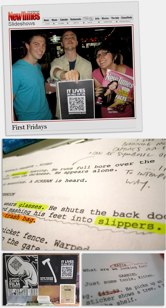 In other news, Synthetic Human crew members Jason Bria, Jarod Anderson, and Colleen Lacy were spotted by the Phoenix New Times last week during downtown's First Friday festivities. The team used the opportunity to promote the new film A Stray as well as Synthetic's viral marketing campaign. You can check out pictures on New Times' website, or scroll down on this page for additional photos.